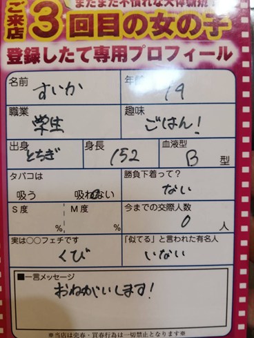 ![]() ![]() 出会い喫茶を利用していると 誰しも一度は経験してること この前まで来店してた女性を 急に見かけなくなったり 抽選で負け話せずそれっきり それは思っていた以上に 普通の女の子だからです 来店する女性の多くは ・軽い気持ち ・興味本位 ・友達の紹介 ・少しのお小遣い目的 そして実際に来てみたら 「人と密に過ごすのが 思ったより疲れる」など 様々な理由で来なくなる これは普通の感覚です 続きはまた明日の朝 ※早くも女性来店絶好調※ 利益還元祭 ![]() ※1月22(木)・23(金) ※ ※ 内 容 詳 細 ※ 一日出入り自由&トークし放題 !!成立無制限!! 6000円 更にご来店の方全員に 還元チケットも進呈! 今年も一年宜しくお願いします!