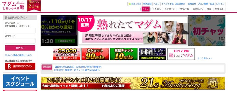 マダムとおしゃべり館は、素人系を中心に30代後半〜50代の人妻・熟女が集まるライブチャットです。