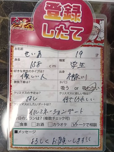 ![]() ![]() 当店はLINEでお客様との やり取りはしてませんが 友達追加してる方が多いので どんな方が追加しているのか 見てたら一言コメントの所に 「感覚を研ぎ澄ませ 強靭な意思を手に入れろ」 的な NIKEのCMに出てきそうな オシャレな格言を書いてる お客様がけっこう多いです 意識高く気を張り詰め過ぎて 女の子と遊びたくなるのか? それともアンチエイジングには 若い子と触れ合うのが最強だよ という事実に気づき始めたのか いずれにせよ アンテナの感度が高い人は 出会い喫茶の良さを 認識しているのかも クリスマスに 口説かないで いつ口説く?! 歴代女性来店人数 ※最高記録級※ ![]() 12月1日から12月30日迄 〓〓 特 典 〓〓 パック料金入店で クリスマススタンプカード 配 布 中 (1)パック料金入店で 1Pプレゼント! (2)カップル成立で 1Pプレゼント! ※5P貯まる毎に※ お得な割引優待! 一年で一番男女が出会う クリスマス月が到来! 女性も出会いを確実に求めてる! 今こそ男達は立ち上がれ! ![]() ![]() 今ならご新規様は ![]() 入会金も実質無料!! このチャンスをお見逃しなく! 《youtuberが当店に潜入?》 逆ナン館フリーパス進呈 ※Aプラン除く。※ ![]() 一度で二度おいしいお店!! |