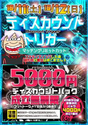![]() 10/19(日)20(月) の2日間連続開催! 通常の3倍得した気分? 見える、見てるぞ、私にも割引券が! ご入店するだけで 1000円割引券GET さらに カップル成立の都度 1000円割引券GET 最大3,000円分 まで 発行いたします! 認めなくて大丈夫です割引券につられてしまったこと。 たまたま来店された日に割引券が付いてただけのこと。 割引券おしではありますが、一度来店しちゃえば しばらくはお得に遊べますので是非このご機会に 遊びに来てください! ディスカウントトリガー! |