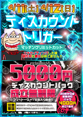 ![]() 開催日:4/11(土)、12(日) (マッチングリミットカット) 当日カップル成立無制限 ●シンプルなワンプラン! ディスカウントパック 5000円で (成立無制限)でのご案内! ※通常7000円⇒5000円(2000円OFF) 歌舞伎町パック 4000円(成立一回付) ありえないディスカウントを 活用して下さい(*'ω'*) ウルトラクーポン! |