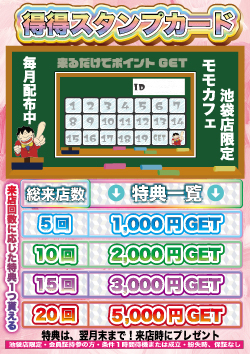 池袋店限定 難しい条件一切無し 来てくれた回数に応じて 特典もらえる ![]() その他詳細は スタッフまたは電話にて お問い合わせください。 |