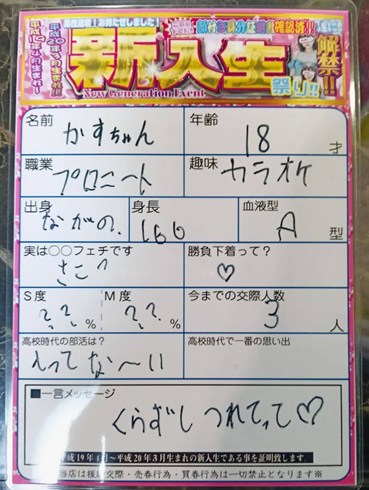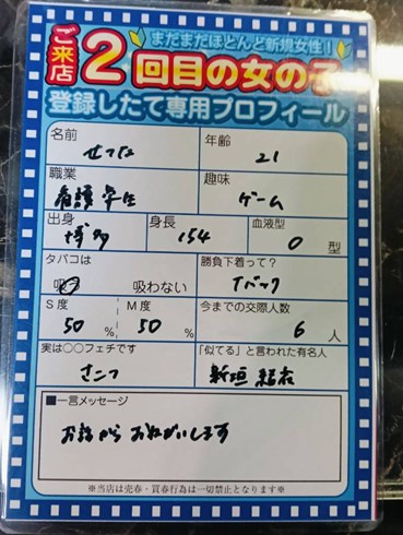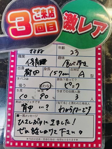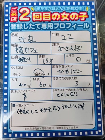 4/18(土)の営業終了です ![]() 本日も多数の来店に感謝 カップル 59組 モモカフェの裏には実は 世界を操る組織があるのでは なんて噂があるとかないとか 安心してくださいスタッフが 操っているのは店内のBGMと エアコンの温度くらいです エプスタインもびっくりな 衝撃的な出会いは陰謀でなく 皆さんの勇気ある一歩から ![]() ![]() ![]() 明日も世界を揺るがすような 素敵なマッチングを目指し 元気に営業していきますよ 「消されないように」 気をつけて帰ってください それでは 平成19年4月→ 平成20年3月生まれ !解禁! ![]() 開 催 期 間 4/1(水)ー5/30(土) パック料金入店&成立毎& 新入生と成立で!! 1ポイントプレゼント ------------------- 5ポイント貯まる毎に 豪華特典進呈! 待ちに待った新世代! 一年このイベントを待っていた 男性達は歓喜の渦へ!! どうぞお楽しみを!!! ![]() 今ならご新規様は ![]() 入会金も実質無料!! このチャンスをお見逃しなく! 逆ナン館フリーパス進呈 ※Aプラン除く。※ ![]() 一度で二度おいしいお店!! |