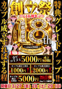 創立祭!開催 ![]() 3/27(金)28(土)29(日) 1日出会い放題 全てコミコミ5000円 更に成立すればするほど 特典グレードアップ